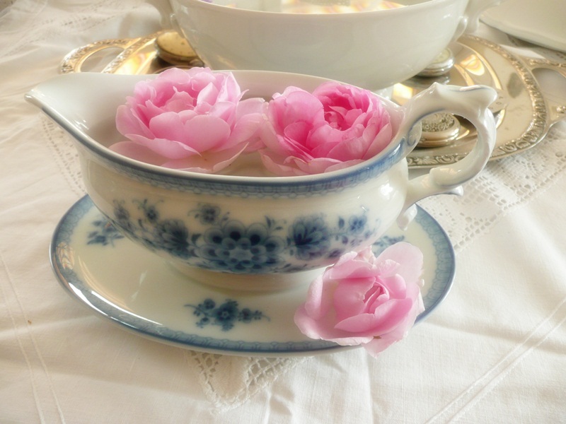 Und dann habe ich zwei solche Terrinen gefunden. Sofort kam mir die Idee mit den Rosen und Kerzen und ich finde, es sieht total schön aus. Gestern abend hatte ich die eine Terrine mit Rosen und Kerzen auf der Terrasse und das sah auch toll aus. Auch hier: bitte melden, wenn sie jemand haben möchte.